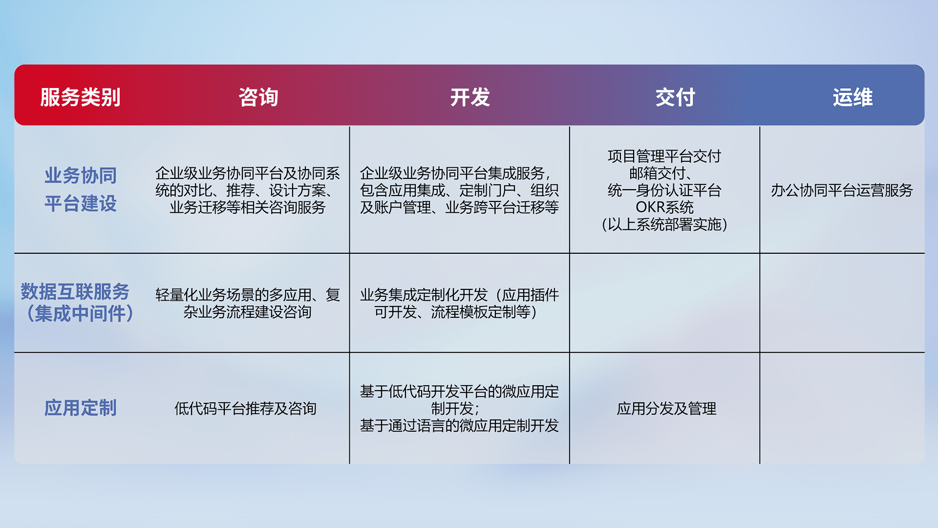 针对钉钉、、企微、、、IDaas等平台级产品提供产品的规划、、、方案、、、交付、、、、定制化开发等服务,,,,实现如统一协同办公、、、智能客户服务、、、混合会议管理、、智能数据查询、、、、等业务场景,,,,实现数字化转型。。